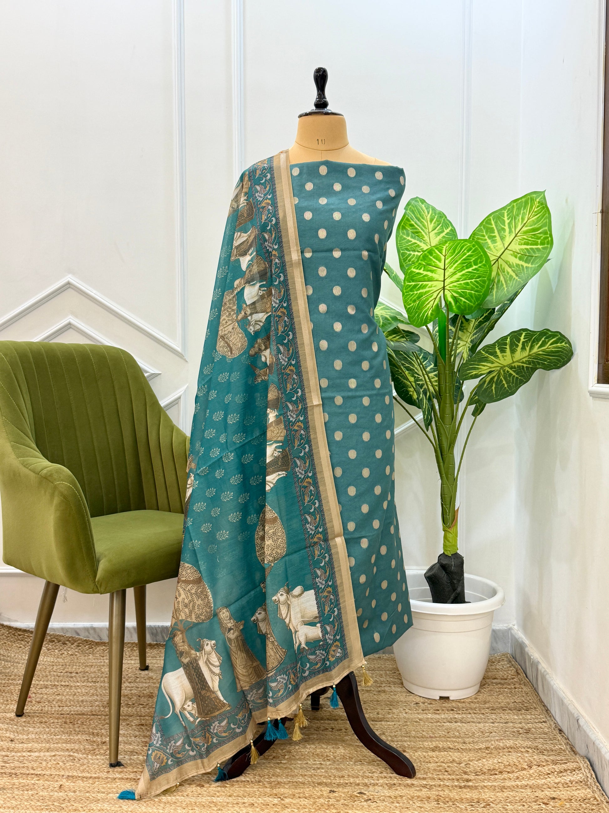 Discover the elegance and beauty of our exclusive Chanderi PICHWAI Suit Dupatta. Featuring delicate zari booti embroidery and made from high-quality cotton and chanderi fabrics, this dupatta is a must-have for any occasion. Each piece comes with a generous 2.50 meters and is paired with a soft, cotton plain bottom for a complete and sophisticated look."