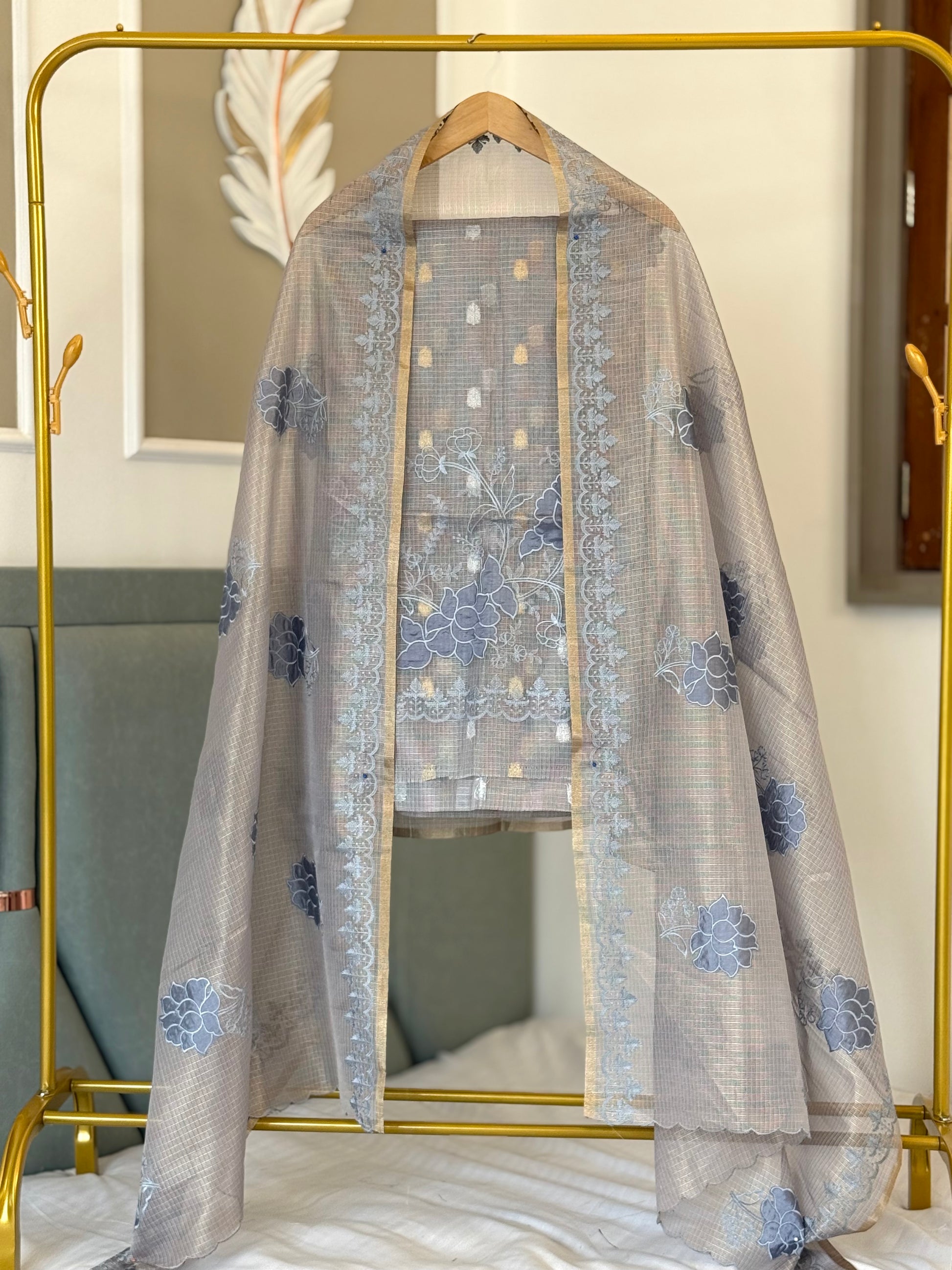 This elegantly designed APLQ set includes a 2.5 mtr applique cutwork dupatta, 2.5 mtr applique cutwork top, and 2.5 mtr plain cotton bottom. Made from luxurious kota tissue fabric, it offers both style and comfort in one. Perfect for any occasion.