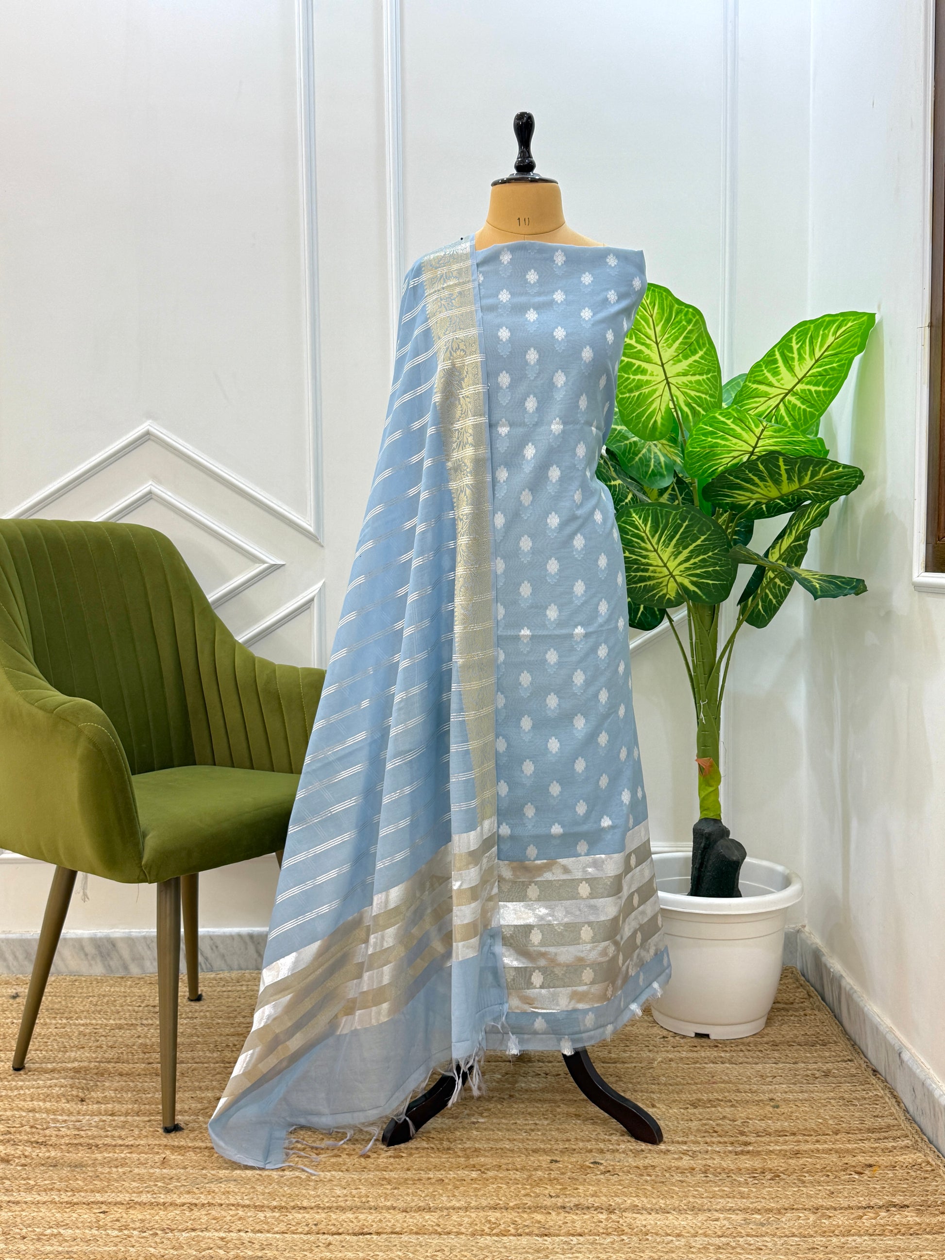 Introducing BOYA - a new arrival that combines elegance and comfort. Our 2.5 mtr chanderi booti daaman weaving top pairs perfectly with the 2.5 mtr chanderi lorex stripes dupatta, while the 2.5 mtr plain cotton silk bottom adds a touch of luxury. Elevate your style with BOYA.