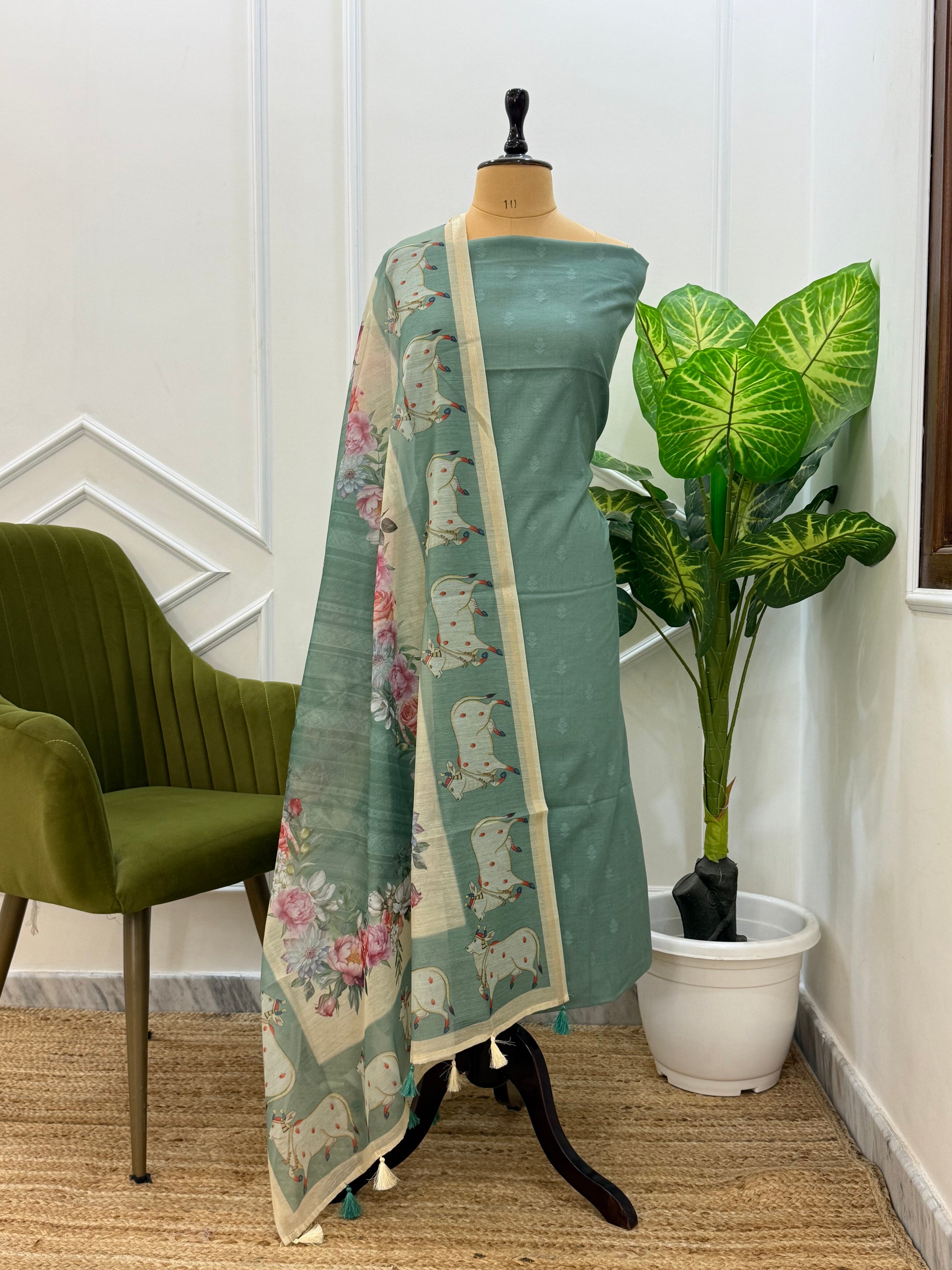 2.5This COWN set features a 2.5 mtr chanderi pichwai printed dupatta, 2.5 mtr chanderi self jaquard weaving booti top, and 2.5 mtr plain cotton silk bottom. Made from high quality materials, this set offers a unique blend of comfort, style, and elegance. Perfect for any occasion, this set is a must-have for any fashion-forward individual.