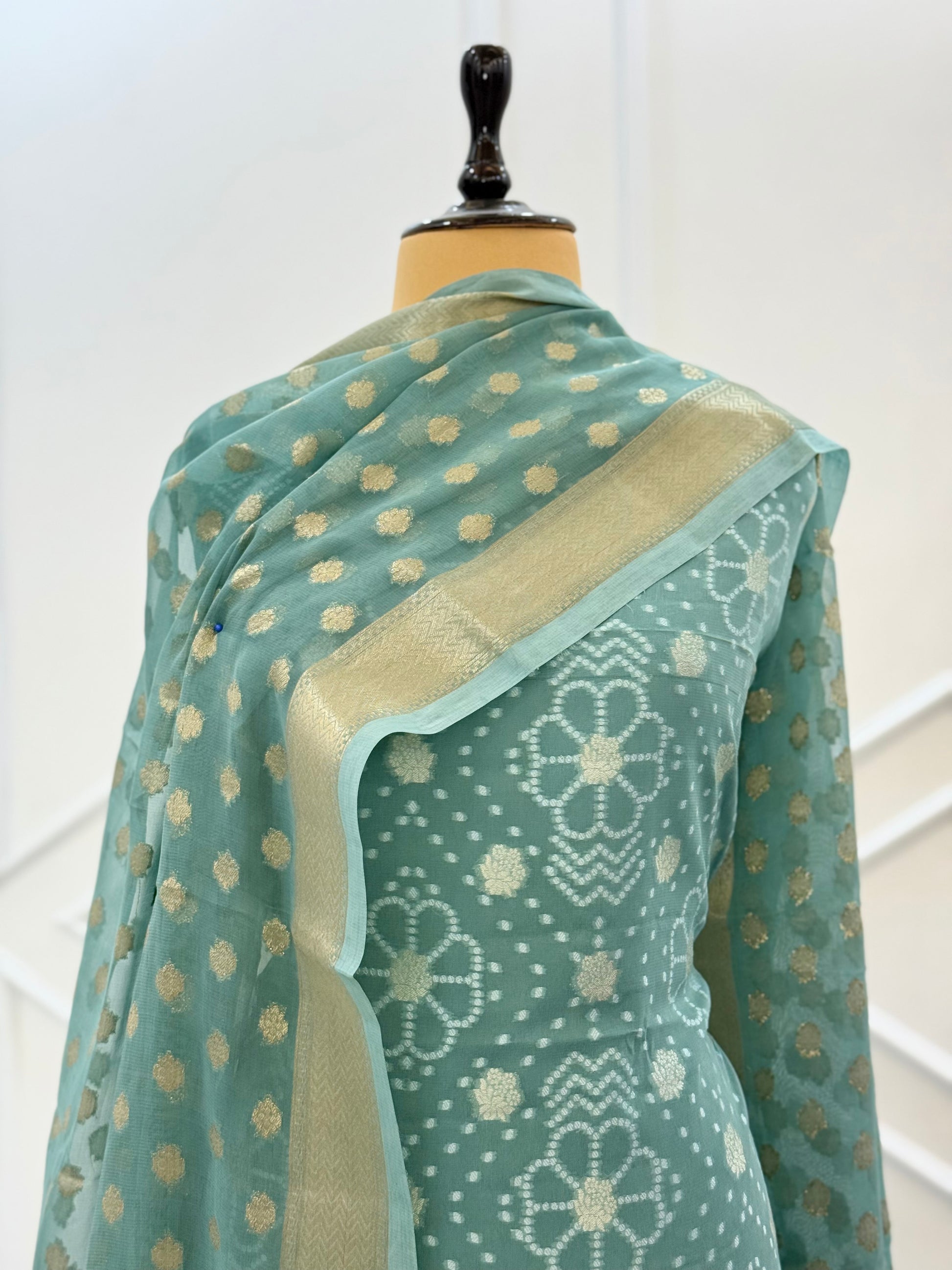 Get instant elegance with Gorgt's 2.5 mtr georgette zari booti weaving dupatta and top, and plain crap bottom. Perfect for any occasion, the soft and silky fabric will add a touch of luxury to your outfit. Crafted with expertise, the zari and thread weaving adds intricate detail and a professional touch.