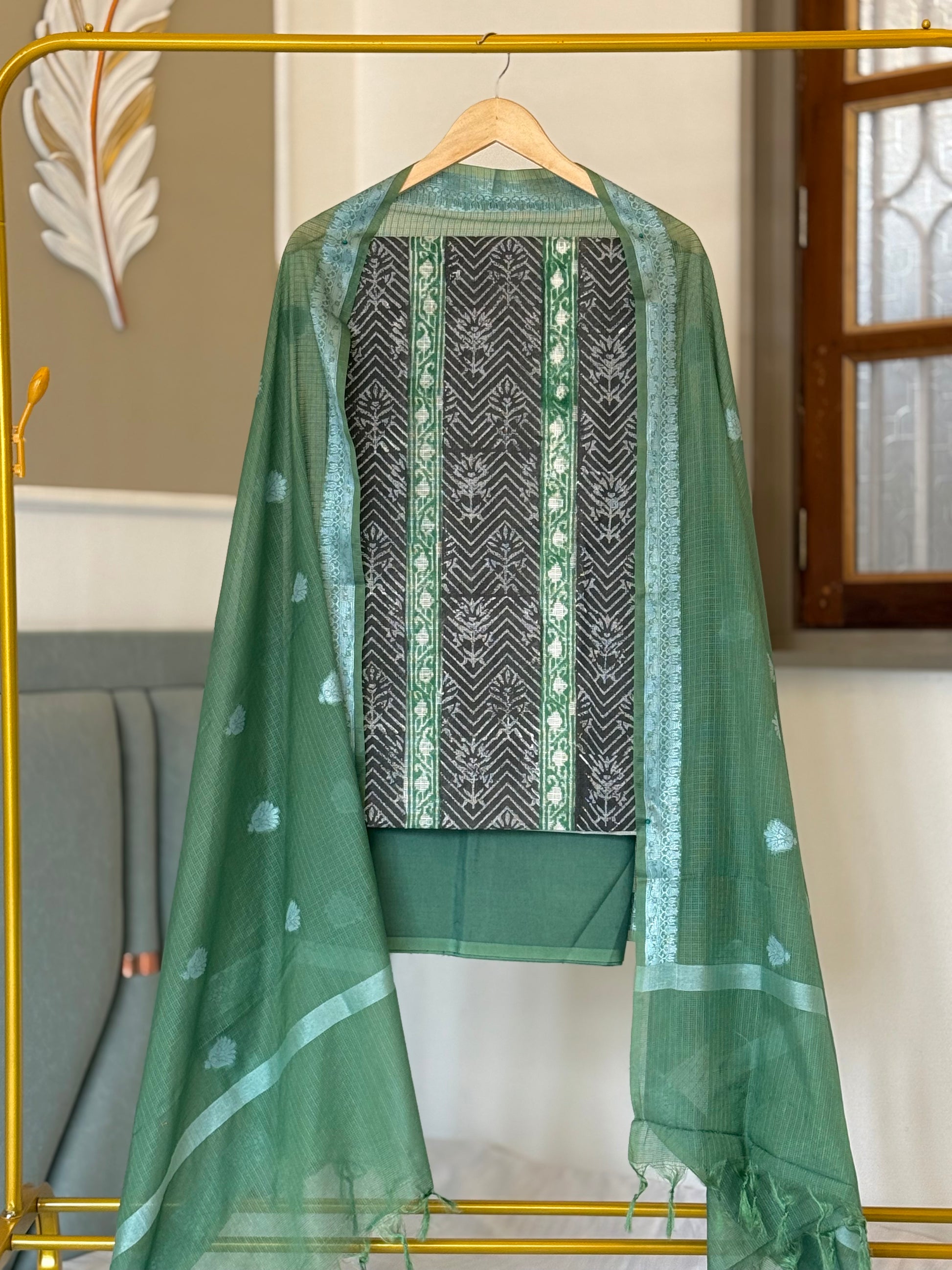 Kirio is a high-quality, handcrafted ensemble featuring a 2.5 mtr kota doria handblock top, 2.5 mtr kota doria thread weaving dupatta, and 2.5 mtr plain cotton silk bottom. This set is specially designed to provide comfort and elegance, making it a must-have for any occasion.