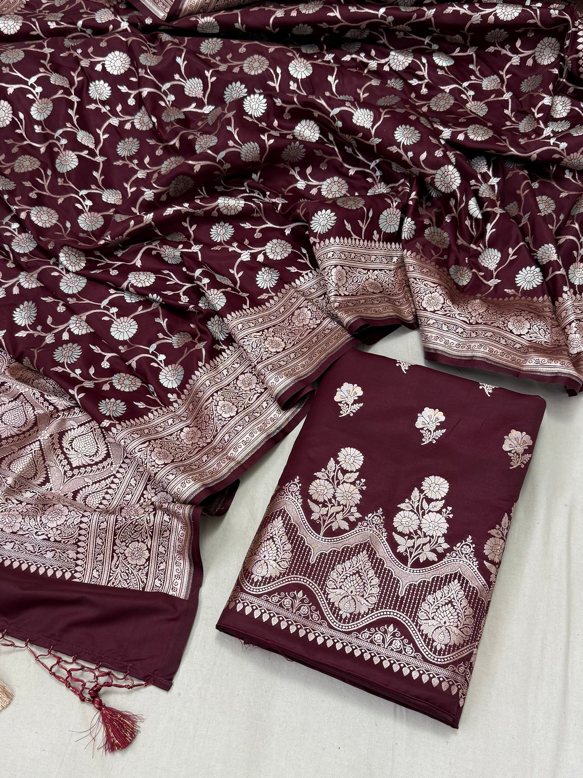 "Mushru3 is a luxurious 3-piece set made of pure katan silk. The stunning alfi jaal dupatta measures 2.5 meters, while the alfi meena daaman top and plain silk bottom each measure 2.5 meters as well. Elevate your attire with the finest silk and intricate designs."