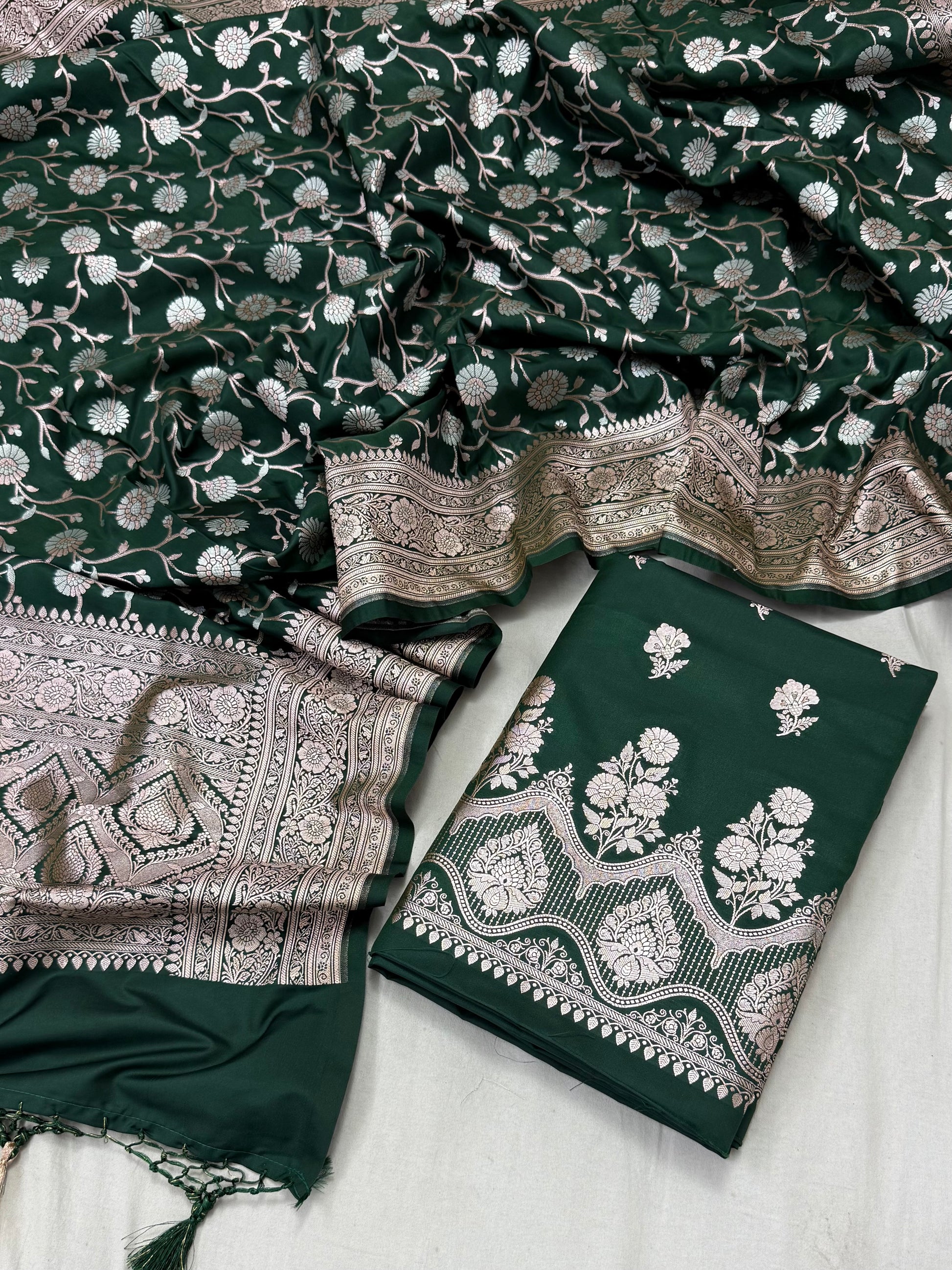 "Mushru 4 is a luxurious 3-piece set made of pure katan silk. The stunning alfi jaal dupatta measures 2.5 meters, while the alfi meena daaman top and plain silk bottom each measure 2.5 meters as well. Elevate your attire with the finest silk and intricate designs."