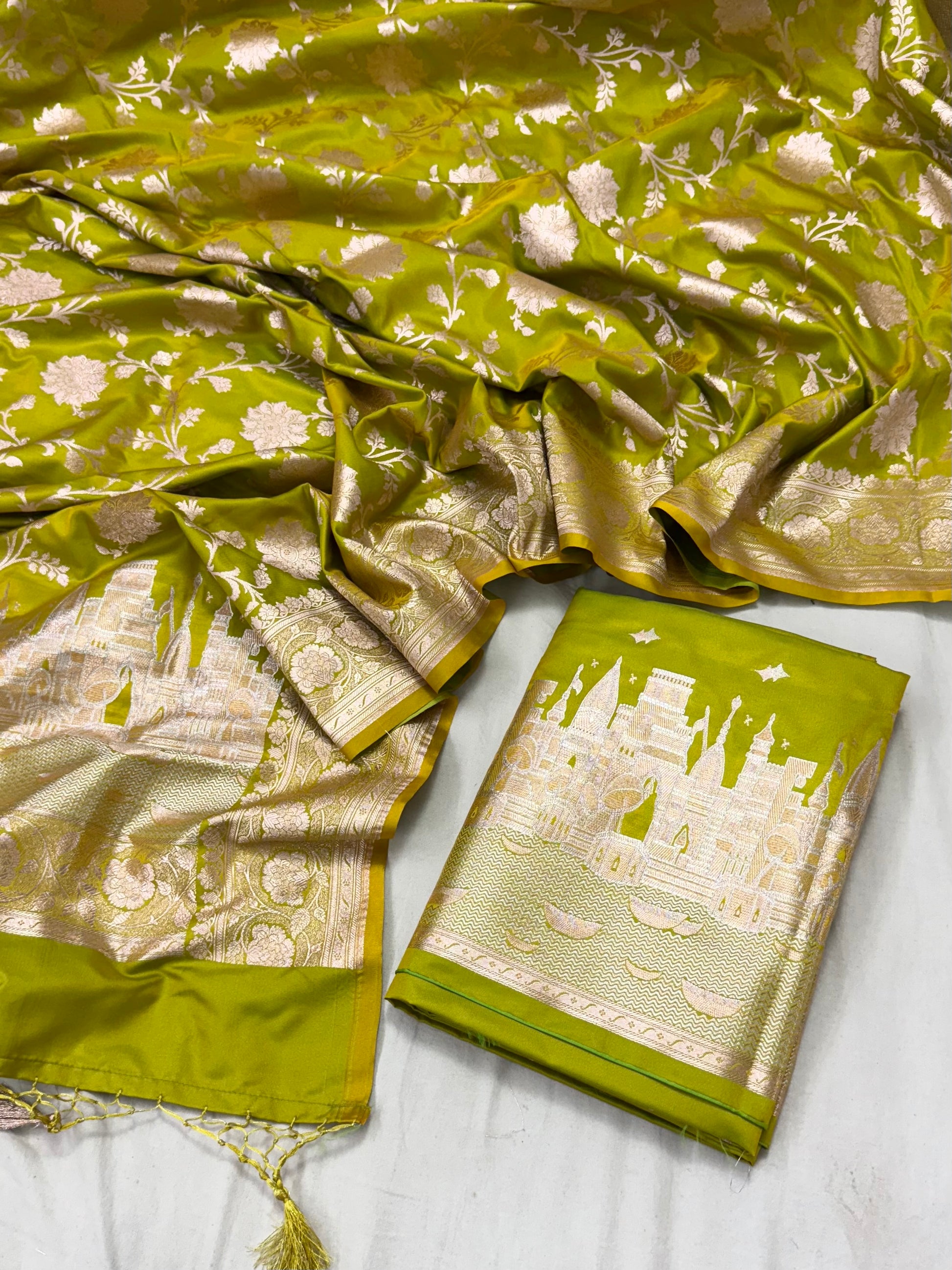 "Mushru 5 is a luxurious 3-piece set made of pure katan silk. The stunning alfi jaal dupatta measures 2.5 meters, while the alfi meena daaman top and plain silk bottom each measure 2.5 meters as well. Elevate your attire with the finest silk and intricate designs."