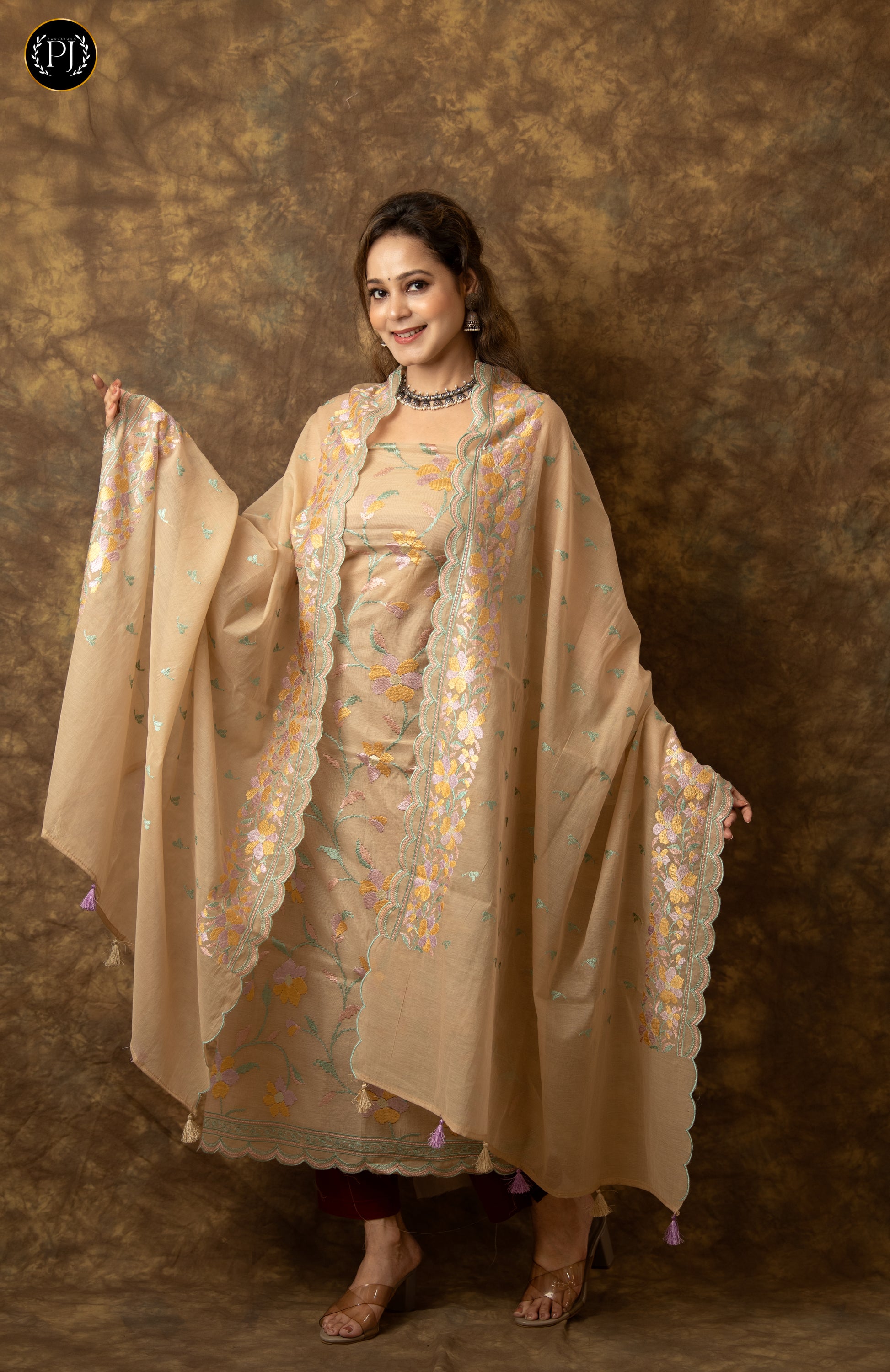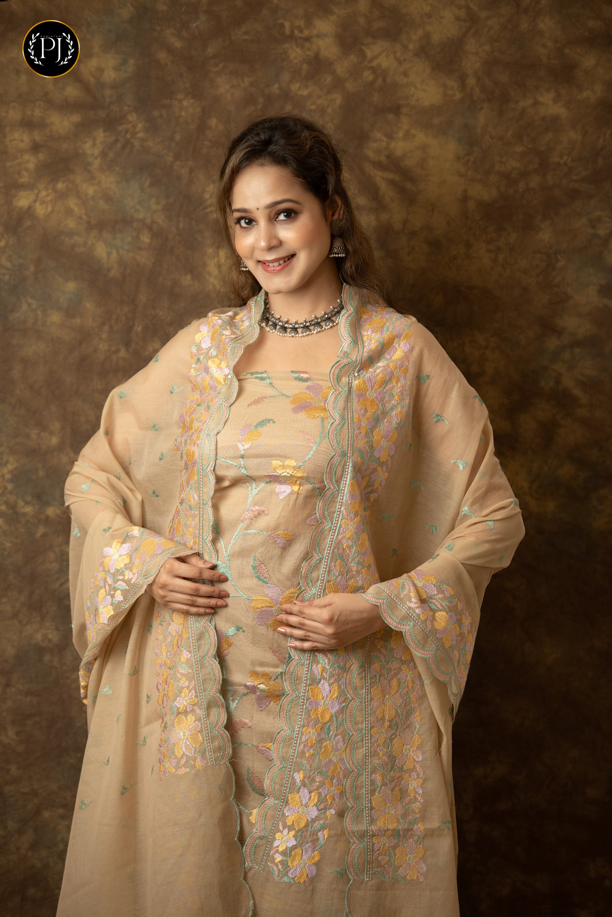 The Mul Emb set includes a beautifully crafted 2.5 mtr mul chanderi cutwork embroidery dupatta and top, along with a soft and smooth 2.5 mtr plain cotton silk bottom. Elevate your wardrobe with this versatile and stylish ensemble, perfect for any occasion.