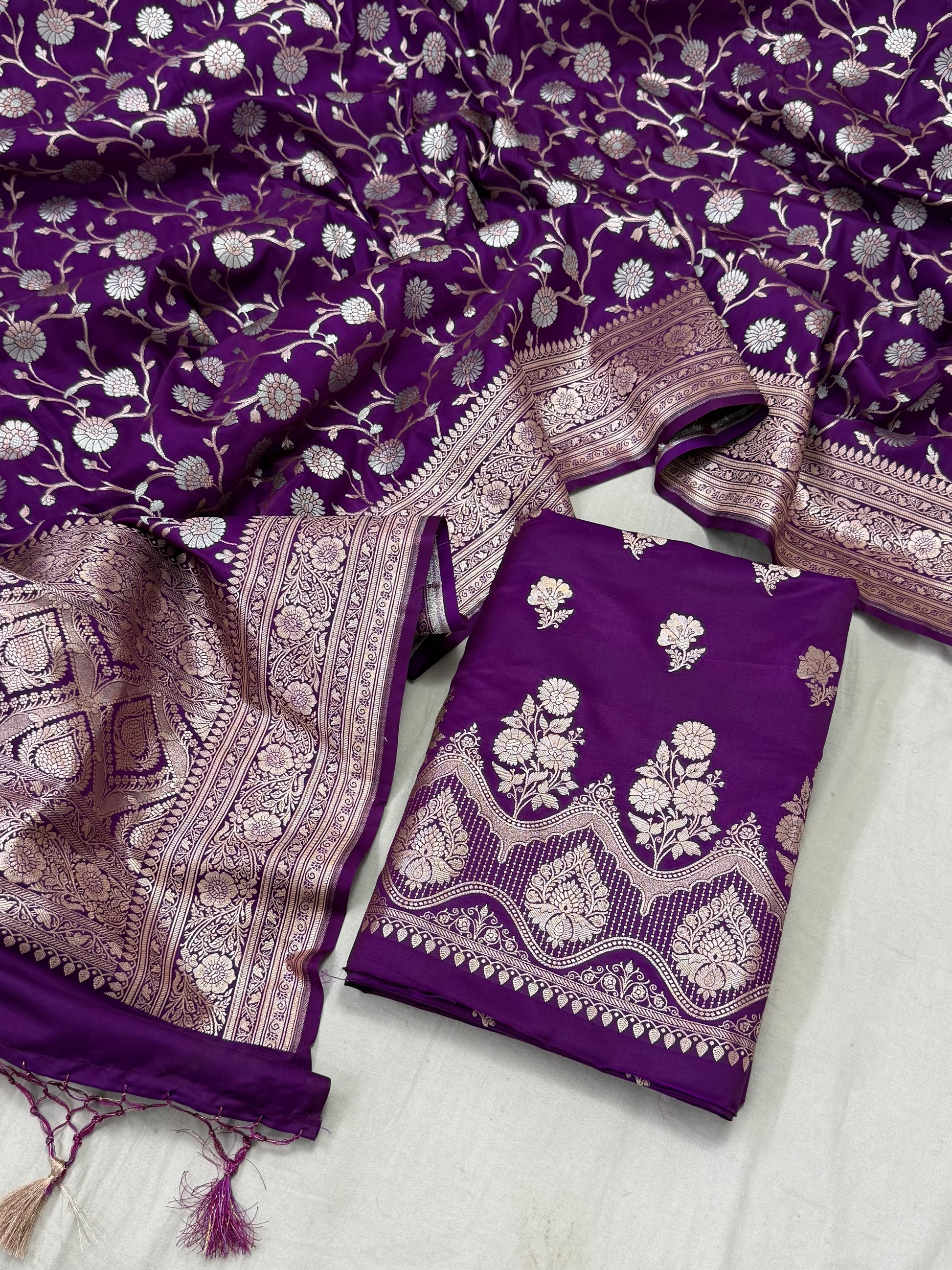 "Mushru 1 is a luxurious 3-piece set made of pure katan silk. The stunning alfi jaal dupatta measures 2.5 meters, while the alfi meena daaman top and plain silk bottom each measure 2.5 meters as well. Elevate your attire with the finest silk and intricate designs."