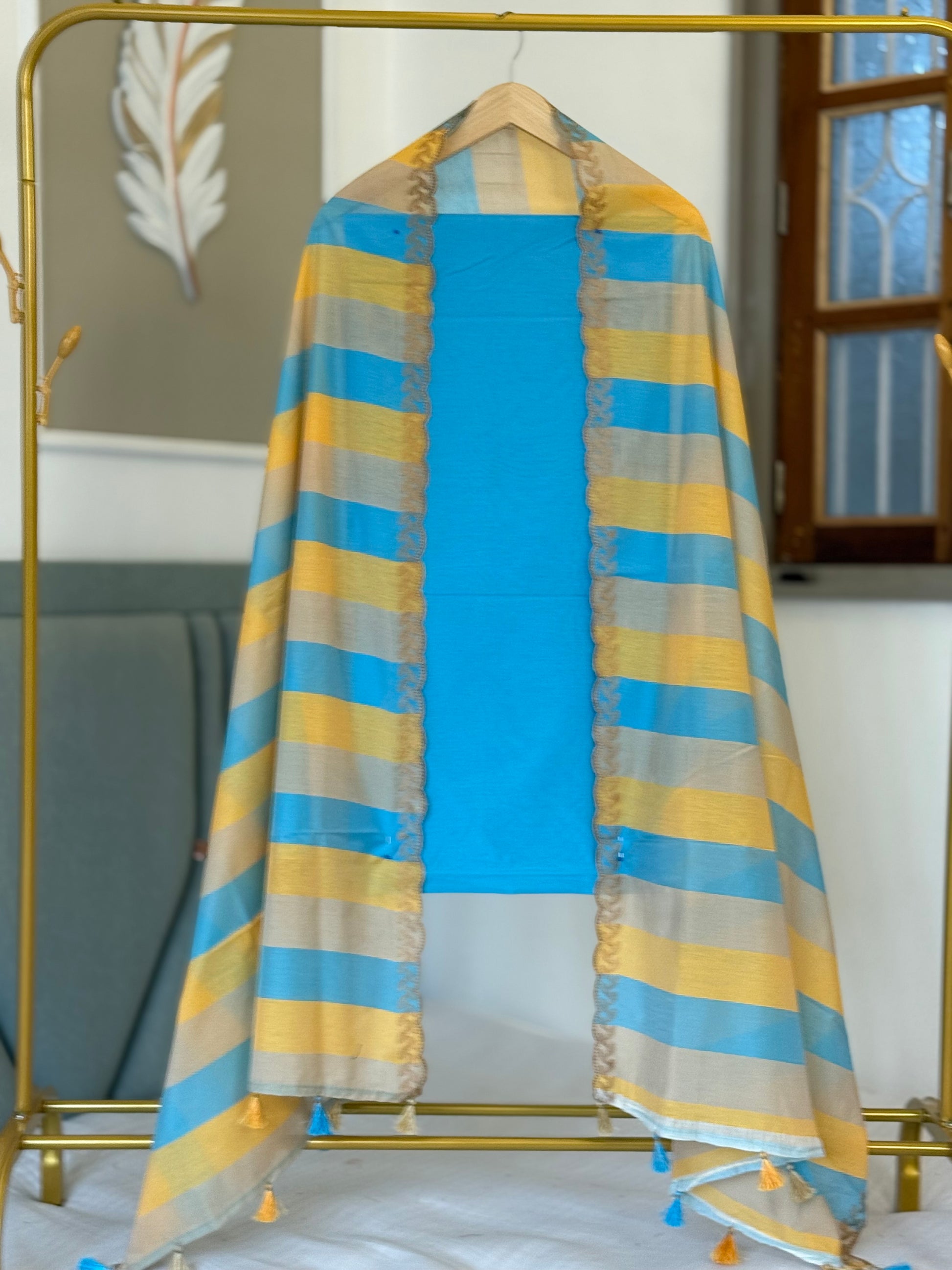 Upgrade your summer wardrobe with SUMMER TREND. This set includes a 2.5 meter multi-striped dupatta with intricate embroidery cutwork, paired with a 2.5 meter plain chanderi bottom and top. Stay cool and stylish all season long with this elegant and versatile ensemble.