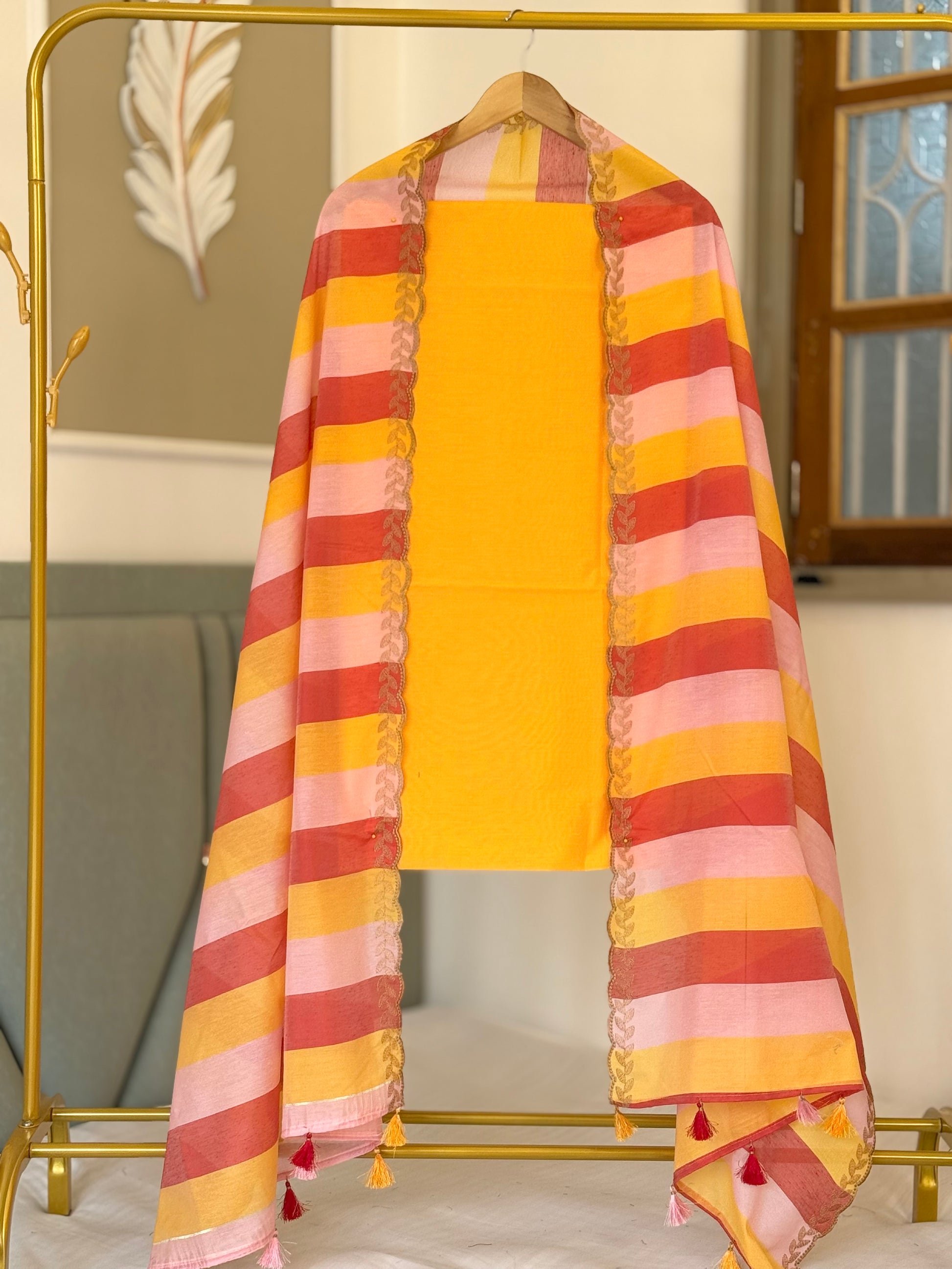 Upgrade your summer wardrobe with SUMMER TREND. This set includes a 2.5 meter multi-striped dupatta with intricate embroidery cutwork, paired with a 2.5 meter plain chanderi bottom and top. Stay cool and stylish all season long with this elegant and versatile ensemble.