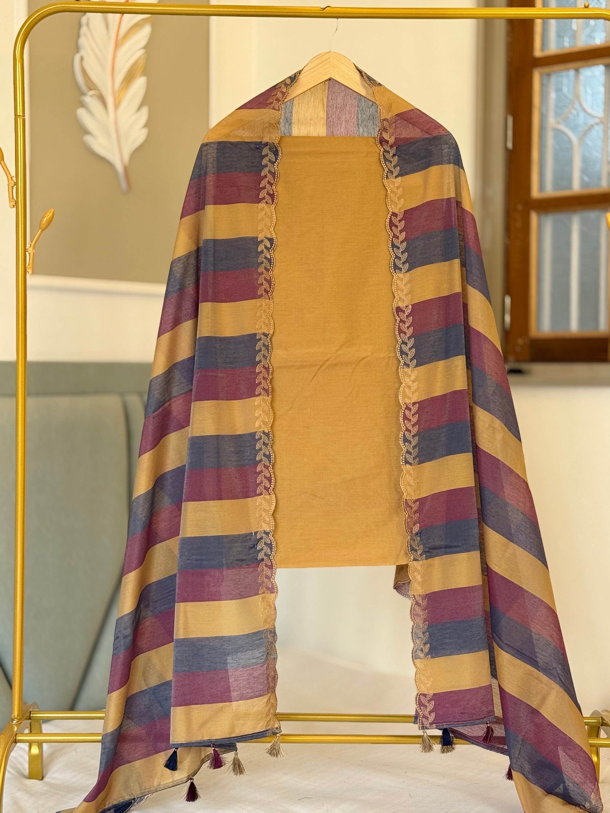 Upgrade your summer wardrobe with SUMMER TREND. This set includes a 2.5 meter multi-striped dupatta with intricate embroidery cutwork, paired with a 2.5 meter plain chanderi bottom and top. Stay cool and stylish all season long with this elegant and versatile ensemble.