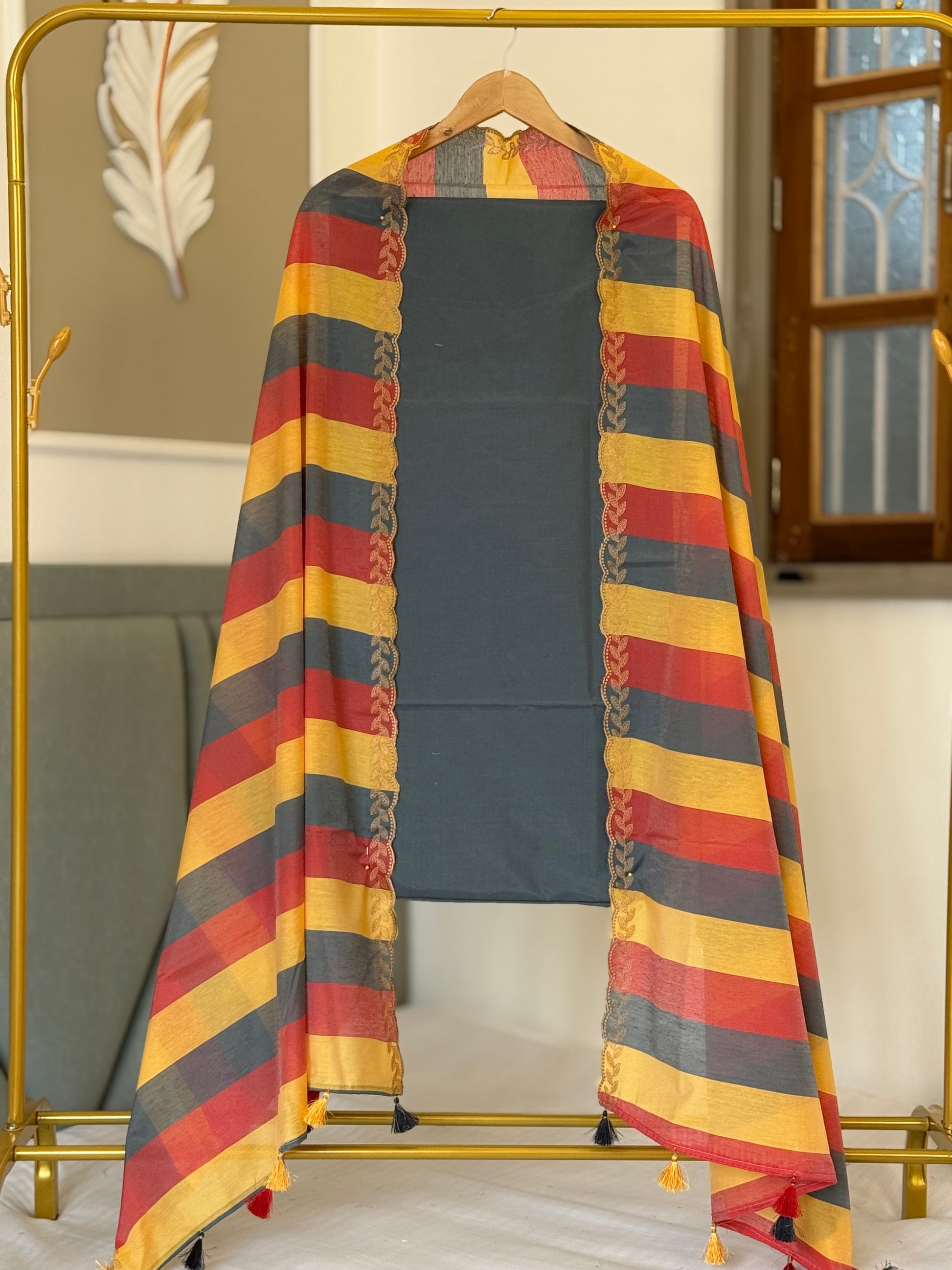 Upgrade your summer wardrobe with SUMMER TREND. This set includes a 2.5 meter multi-striped dupatta with intricate embroidery cutwork, paired with a 2.5 meter plain chanderi bottom and top. Stay cool and stylish all season long with this elegant and versatile ensemble.
