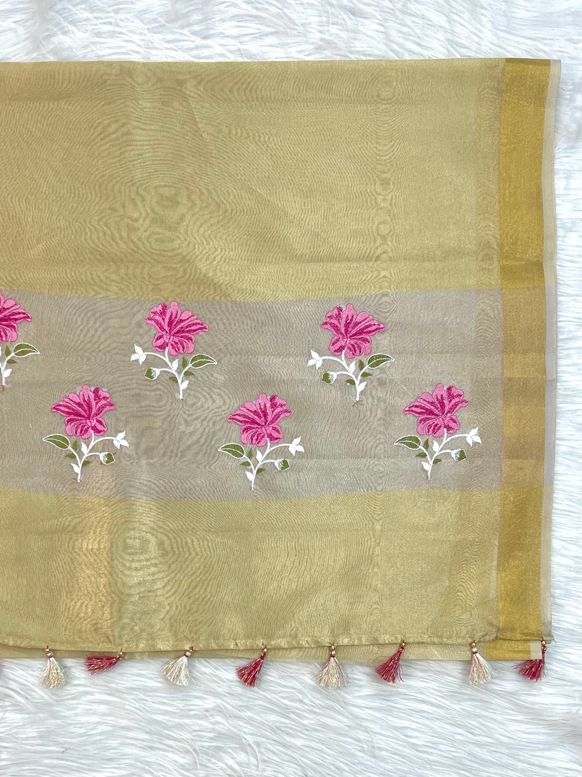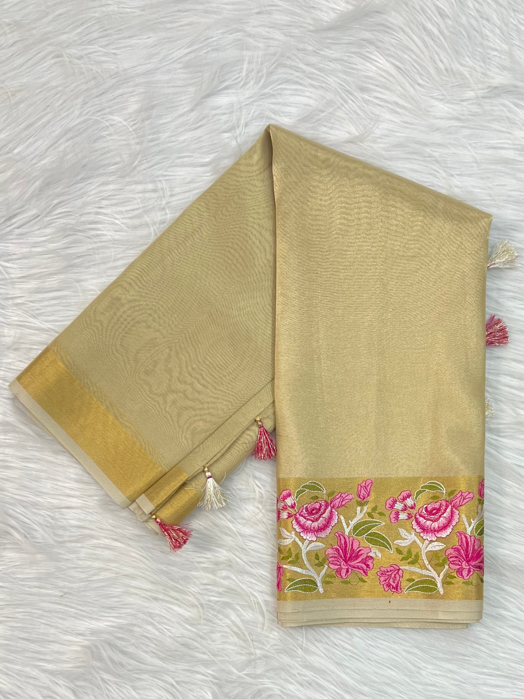 5.5 mtr tissue embroidery saree with embroidery pallu