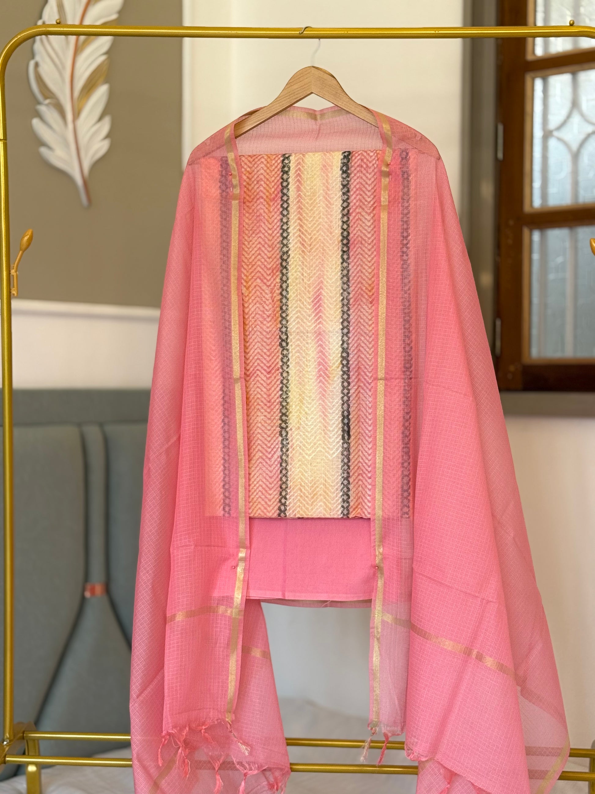 The Vinom ensemble features handblock top and plain dupatta in 2.5 mtr kota doria fabric, paired with a plain cotton silk bottom of the same length. This traditional and elegant outfit offers a comfortable and stylish look, perfect for any occasion.