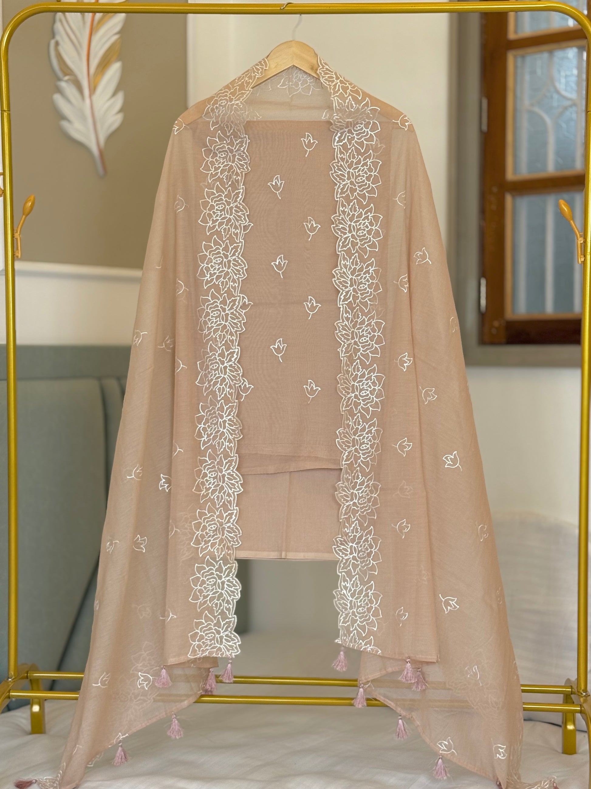 Expertly crafted WIZI set features a 2.5 mtr cutwork embroidery dupatta and top, plus a 2.5 mtr plain cotton silk bottom. Enhance your wardrobe with versatile pieces perfect for any occasion.