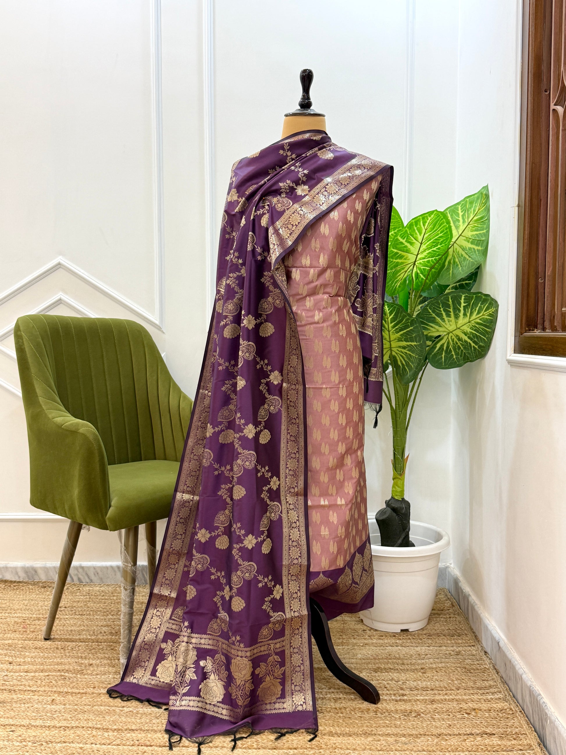 Discover the luxury and elegance of the ZERI set. Made from high-quality 2.5 mtr katan silk, this set features a beautifully designed jaal dupatta, a booti daaman top, and a plain bottom. Elevate your style with this sophisticated and versatile ensemble.