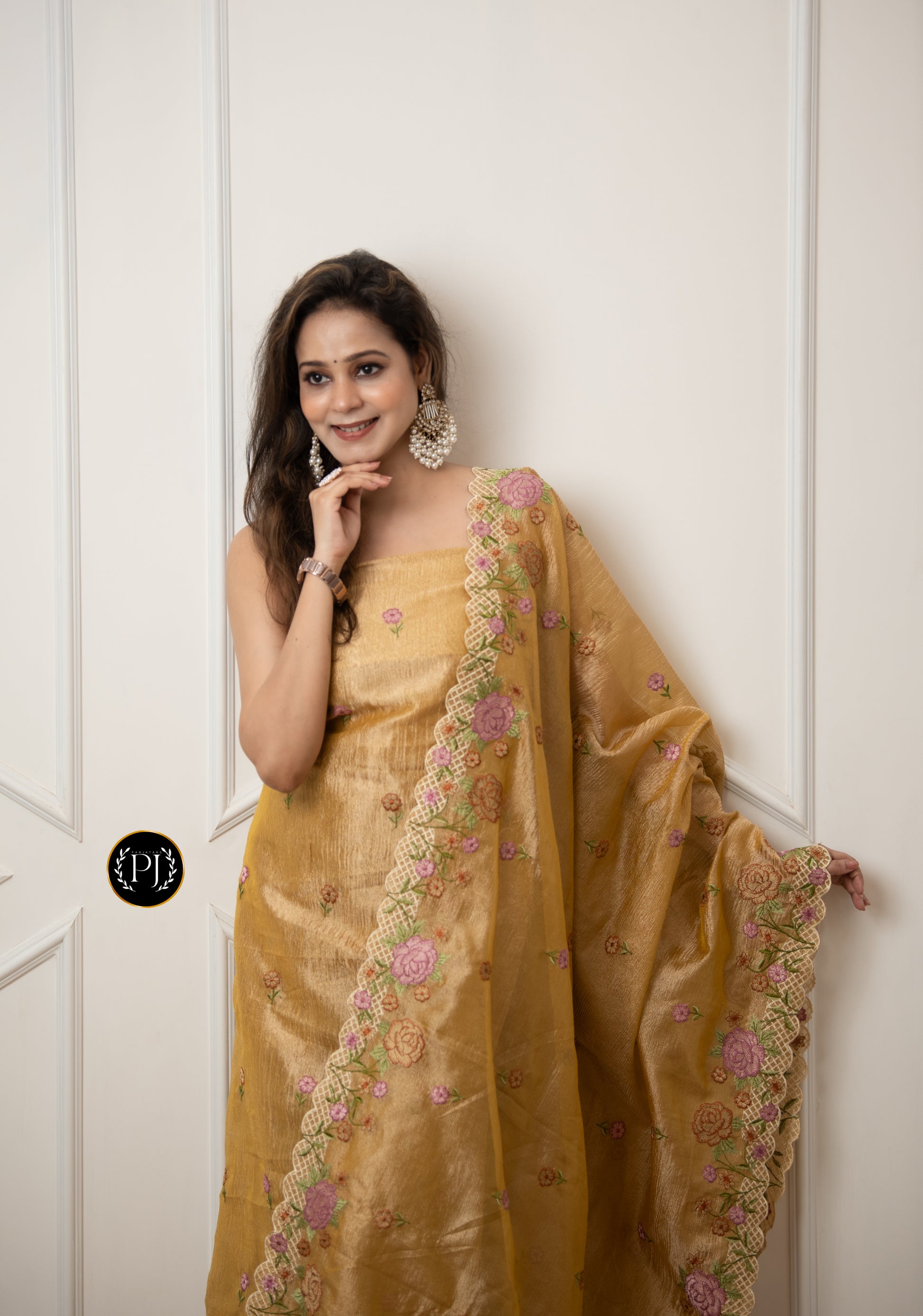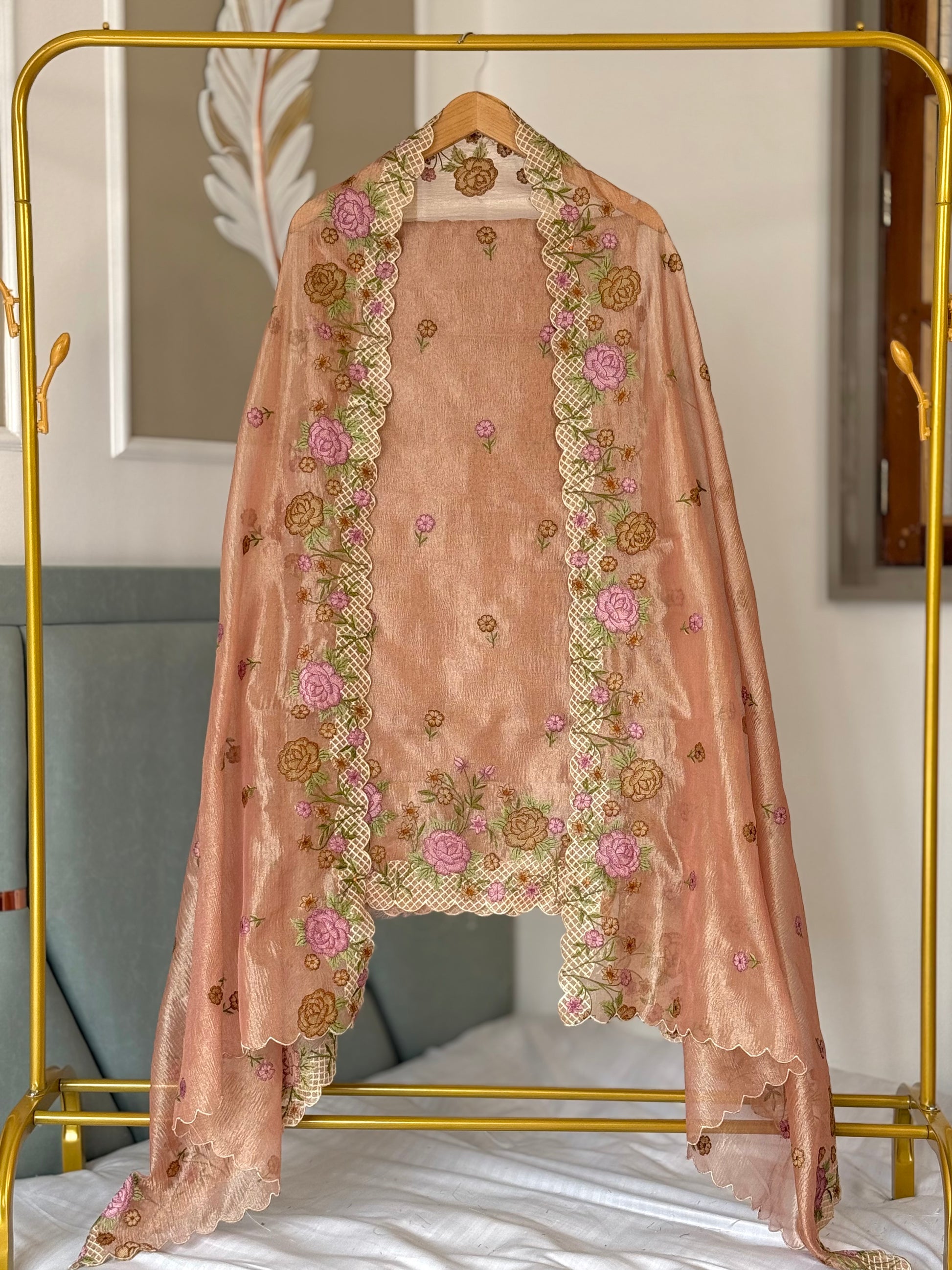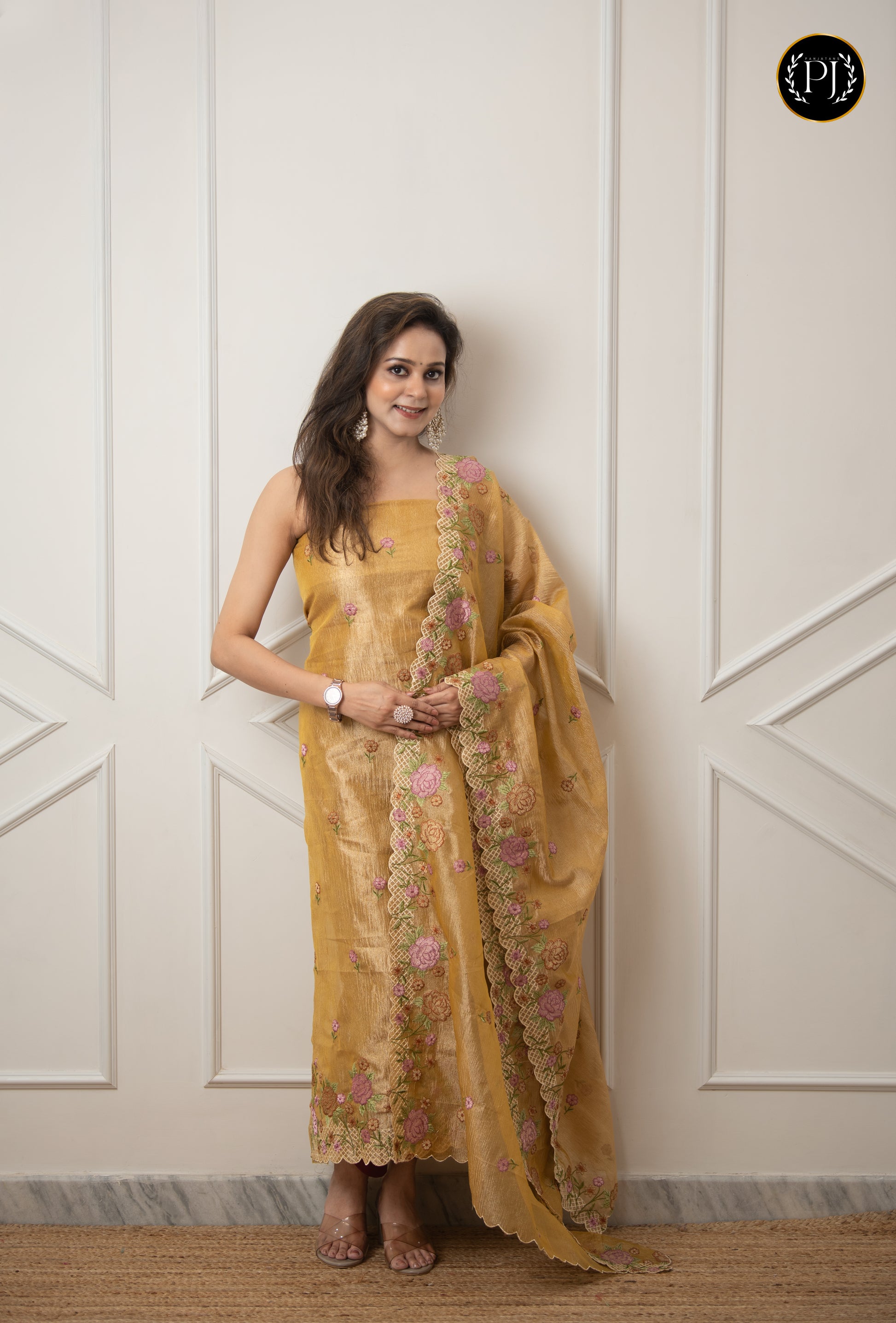 ZERIN offers a complete outfit with a 2.5 mtr tissue crushed embroidery cutwork dupatta, 2.5 mtr tissue crushed embroidery cutwork top, and 2.5 mtr plain cotton silk bottom. This elegant combination provides a stylish and comfortable look for any occasion. Experience the luxury of high-quality materials and intricate design.